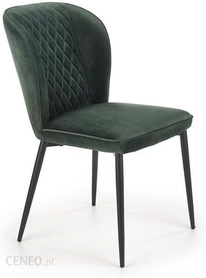 Eleganckie krzesło K399 osadzone na metalowych nogach, tapicerowane jest tkaniną aksamitną, kojarzoną z luksusem.
