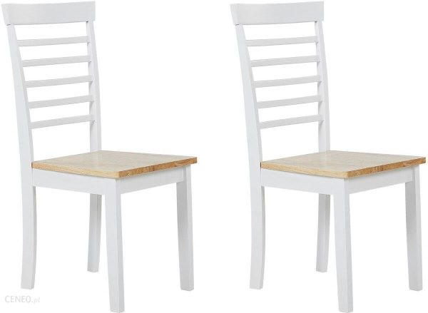 Ten komplet krzeseł do jadalni prezentuje minimalistyczny wygląd, który ładnie wpasuje się w każdą nowoczesną przestrzeń i nigdy nie wyjdzie z mody. Posiada siedzisko z naturalnym wzorem słoi i sęków z wysokim drabinkowym oparciem. Dzięki prostemu wzornictwu będzie dobrze prezentować się w zestawieniu z drewnianym stołem we wnętrzach w stylu skandynawskim lub rustykalnym. Konstrukcja z mocnego drewna kauczukowego ma lakierowane wykończenie zapewniające gładką powierzchnię i lekko błyszczący wygląd siedziska.Szczegóły:Kolor: Jasne drewno, Biały.Materiał: Drewno kauczukowe.Waga: 13Montaż: Wymaga kompletnego montażuPochodzenie drewna: MalezjaMaksymalny dopuszczalny ciężar: 80Wysokość siedziska: 44