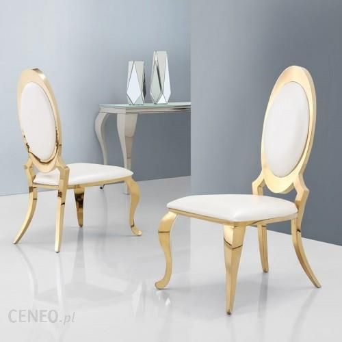 Złote krzesło glamour Victoria o pięknym, klasycznym kształcie.Wykonane z polerowanej stali szlachetnej w kolorze złotym i pokryte białą, polerowaną ekoskórą.Stylowe złote krzesła glamour Victoria charakteryzują się elegancją i funkcjonalnością.Nowoczesny design w formie owalnego oparcia ubranego w zgrabną ramę ze złotej stali szlachetnej, nadaje całemu krzesłu klasy i wyjątkowości. Krzesło Victoria doskonale sprawdzi się w salonie, w gabinecie czy w zestawie z konsolą tworząc urokliwą i funkcjonalną toaletkę. Tapicerka modelu krzesła Victoria dostępna jest w czarnym welurze, czatrnym welurze pikowanym kryształkami oraz w perłowej ekoskórze.Krzesła z modelu Victoria dostępne są w srebrnej i złotej szlachetnej stali polerowanej.