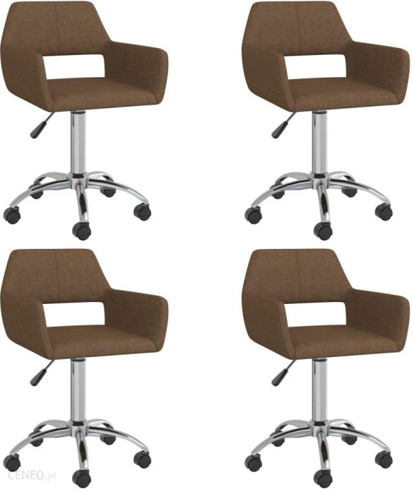 Charakteryzujące się stylowym i nowoczesnym designem, obrotowe krzesła stołowe będą praktycznym dodatkiem do Twojej przestrzeni domowej.Wypełnione grubą gąbką krzesło z pewnością zapewni optymalny komfort siedzenia. Pozwoli Ci ono cieszyć się swoim posiłkiem, czytaniem lub odpoczynkiem w salonie. Podnośnik gazowy umożliwia regulację wysokości siedziska. Mebel ten obraca się swobodnie o 360 stopni, a kółka ułatwiają jego przestawianie. Ponadto wspiera się on na metalowych nogach, co zapewnia większą stabilność.Kolor: brązowyMateriał: tkanina (100% poliester), sklejka, chromowany metalWymiary całkowite: 52,5 x 53 x (76-88) cm (szer. x gł. x wys.)Wymiary siedziska: 40 x 42 cm (szer. x gł.)Wysokość siedziska nad ziemią: 45-57 cmWysokość oparcia: 35 cmMożliwość obrotu o 360 stopniPodnośnik pneumatyczny Łatwe przesuwanie dzięki 5 skrętnym kółkomWymagany montaż: takZawartość paczki:4 x krzesło stołowe