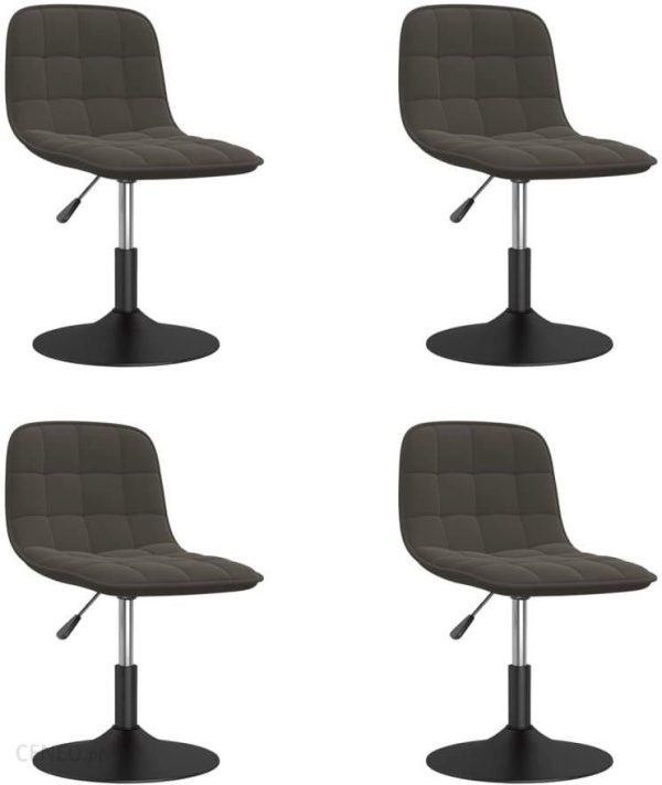 Te obrotowe krzesła stołowe to stylowe meble, idealne do Twojego domu.Obite miękkim w dotyku aksamitem krzesła obrotowe są bardzo wygodne i trwałe. Rama ze stali malowanej proszkowo zapewnia wysoką wytrzymałość i stabilność. Podnośnik gazowy umożliwia regulację wysokości mebla, aby znaleźć wygodne ustawienie. Dodatkowo krzesło to może swobodnie obracać się w zakresie 360 stopni.Kolor: ciemnoszaryKolor stali: czarnyMateriał: malowana proszkowo stal, aksamit (100% poliester)Materiał wypełnienia: gąbka Wymiary całkowite: 42,5 x 45 x (65-79,5) cm (szer. x gł. x wys.)Głębokość siedziska: 35 cm Średnica podstawy: 41 cmMożliwość obrotu o 360 stopniPodnośnik pneumatyczny Wymagany montaż: takZawartość przesyłki:4 x krzesło stołowe