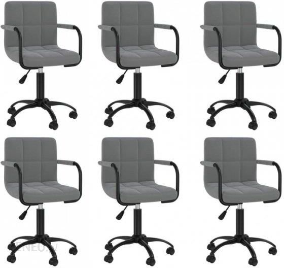 vidaXL Obrotowe krzesła stołowe, 6 szt., ciemnoszaStylowe, obrotowe krzesła stołowe będą praktycznym i nowoczesnym dodatkiem do Twojej jadalni i kuchni. Obite miękkim w dotyku aksamitem krzesła obrotowe z pewnością zapewnią Ci optymalny komfort siedzenia. Ramy z malowanej proszkowo stali gwarantują ich stabilność. Dzięki podnośnikowi gazowemu można wyregulować wysokość mebla. Siedzisko obraca się o 360 stopni, oferując pełną swobodę, a kółka ułatwiają przemieszczanie się po pokoju.Kolor: ciemnoszaryKolor stali: czarnyMateriał: malowana proszkowo stal, aksamit (100% poliester) Materiał wypełnienia: gąbka Wymiary całkowite: 40 x 47 x (76-87,5) cm (szer. x gł. x wys.)Szerokość siedziska: 40 cm Możliwość obrotu o 360 stopniPodnośnik pneumatyczny Wymagany montaż: takZawartość przesyłki:6 x krzesło stołowe